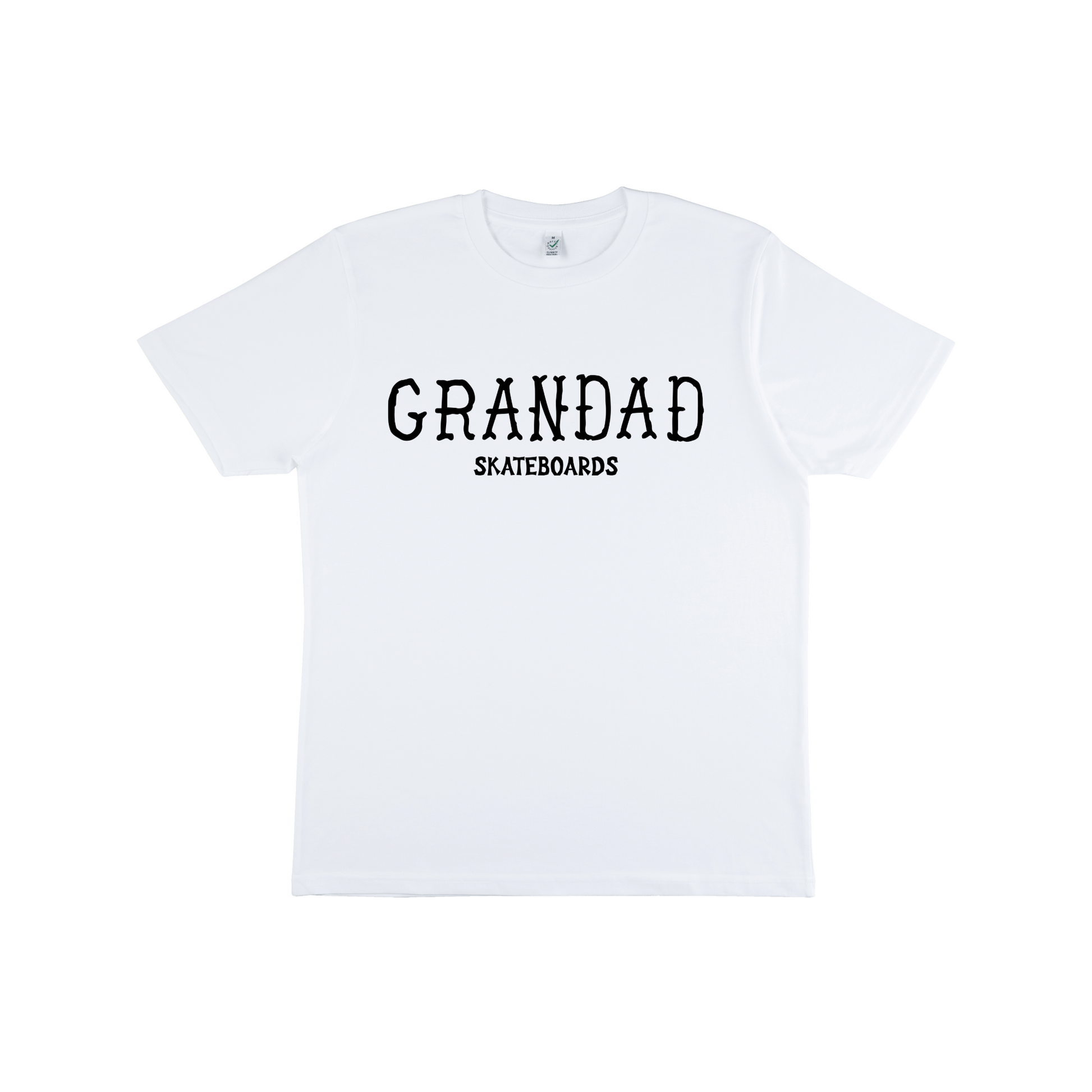White Grandad Skateboards Dead Alen Large logo tee (Black Logo). Made from 100% GOTS (Global Organic Textile Standard) organic cotton, compact spun, climate neutral and vegan approved. Although the sizes quoted are technically men's it's all just unisex so adjust accordingly.